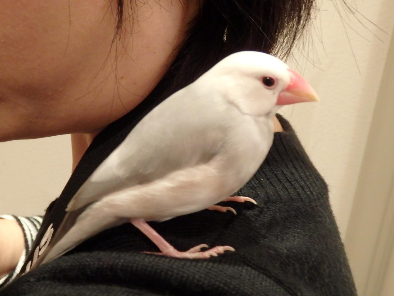 文鳥のはるさんに遊んで貰いました。肩まで来てくれた。