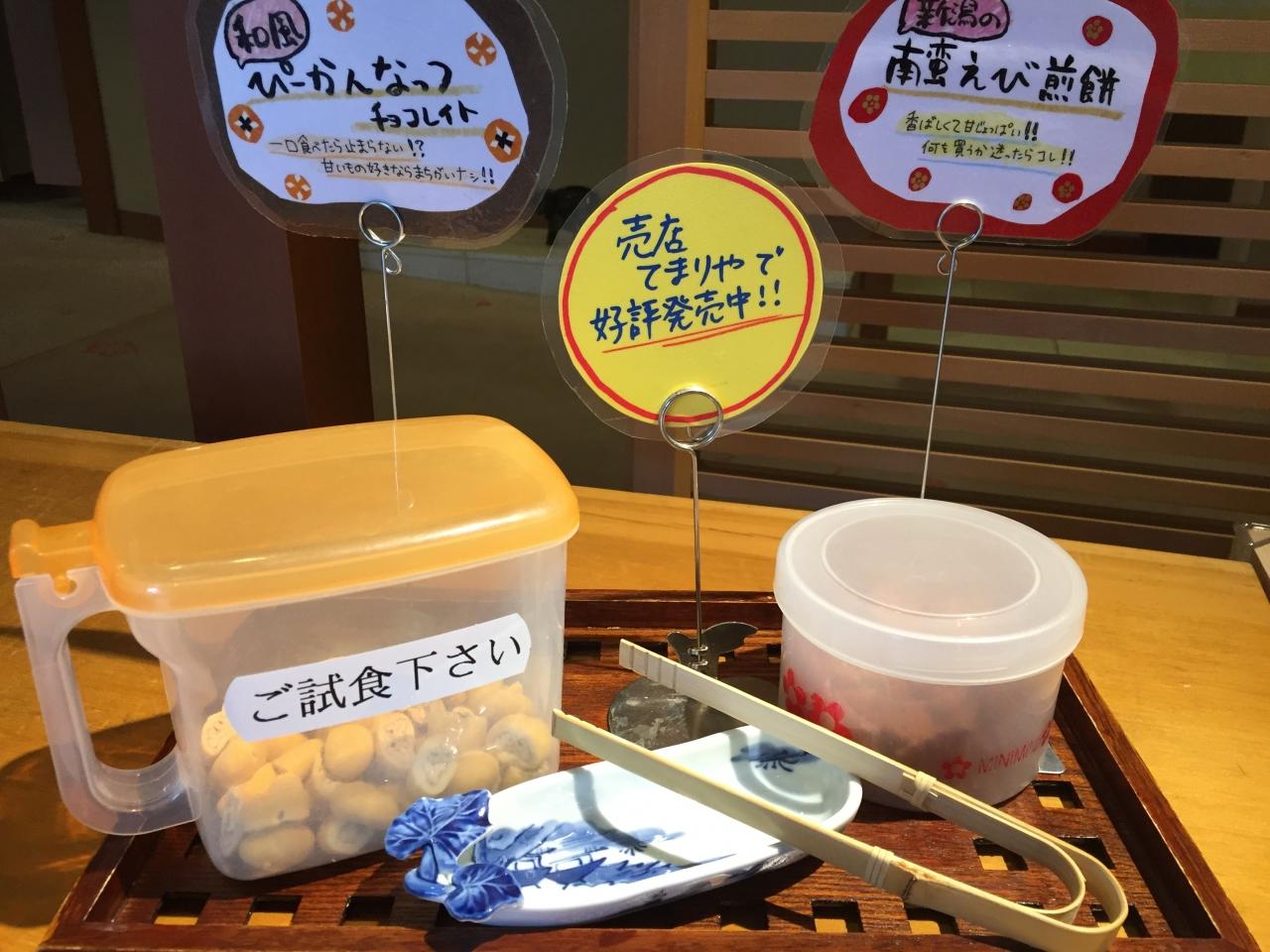 自家製の甘酒とぴーかんなっつ・南蛮海老のおせんべいの試食があります。 -
