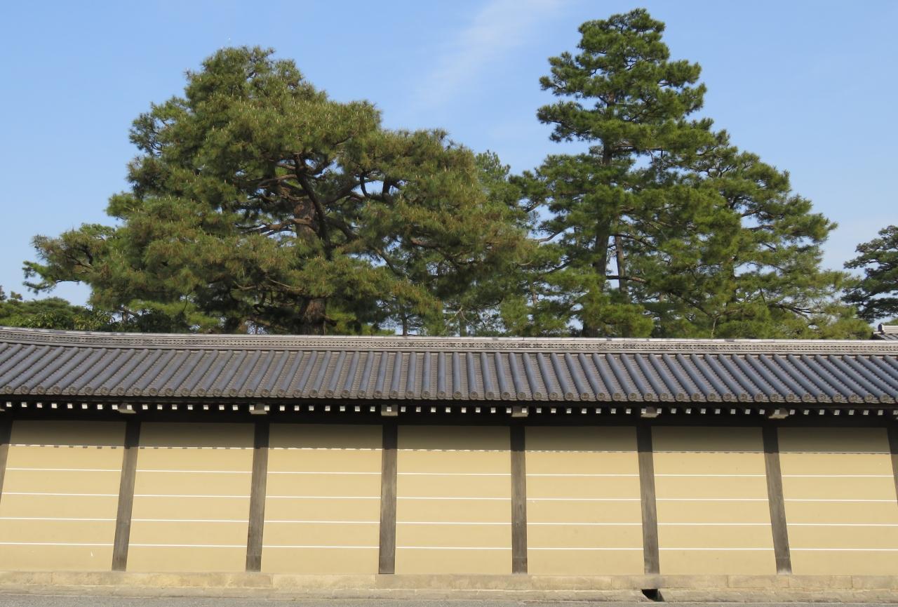 京都御所の築地塀と、その上に頭を出した御所の庭木の光景です。築地塀は、5本の筋が入った、最も格式の高いものとされます。