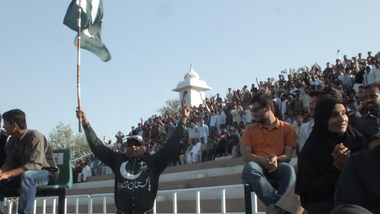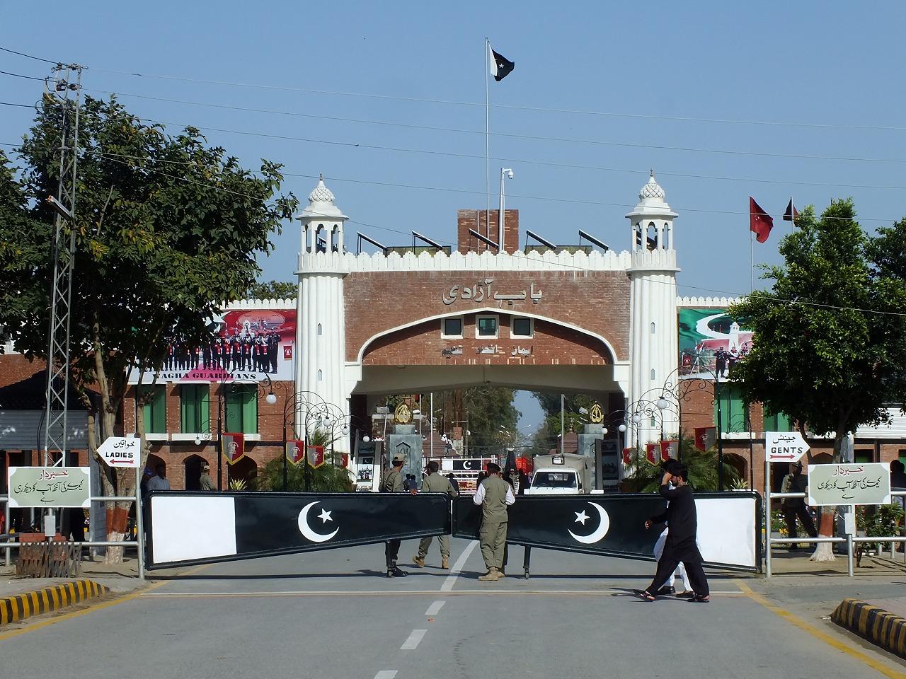 国境ゲートが開けられ、まるで威嚇するようなポーズをとるパキスタン兵士。