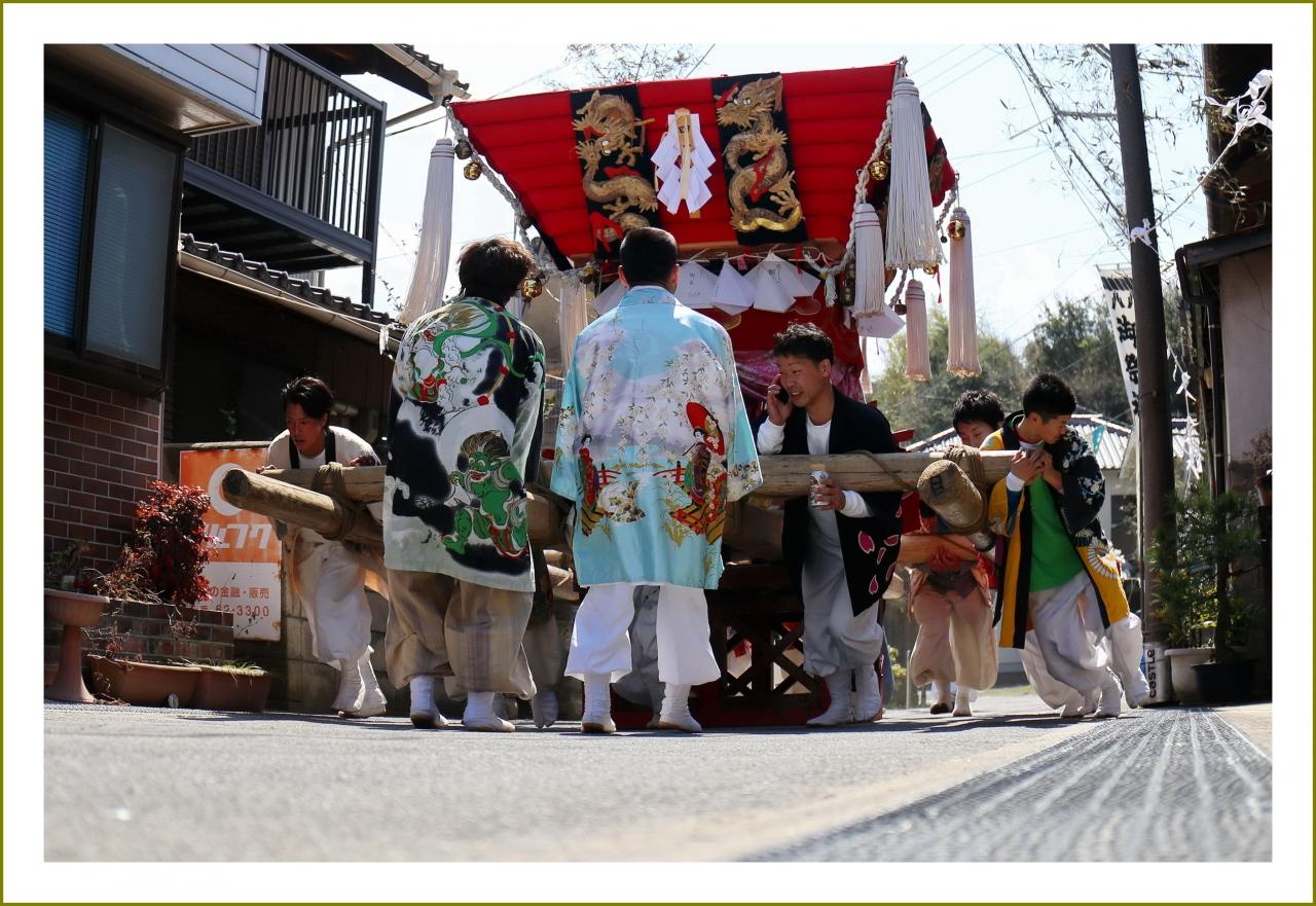 この祭りには、神輿(みこし)の渡御(とぎょ)があり、それに1丁目〜4丁目の各町内から上に7枚のふとんを飾った「ふとんだんじり」が備奉(ぐぶ)します。 -