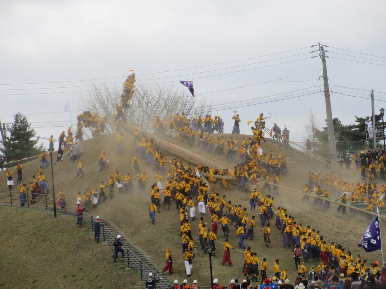 綱を引き御柱を坂の下へ -