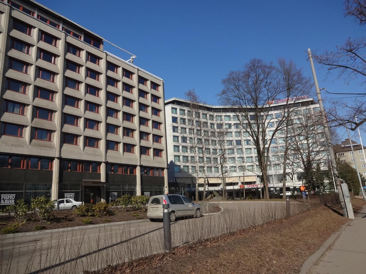 4,7,10のトラム乗り換えて、ホテルに向かいます。国立博物館の次の駅で降ります。トラム駅を降りて、斜め前を見ると、建物が二つ見えます。(降りたところから望遠で撮っています)。奥の白い建物がクラウンです。