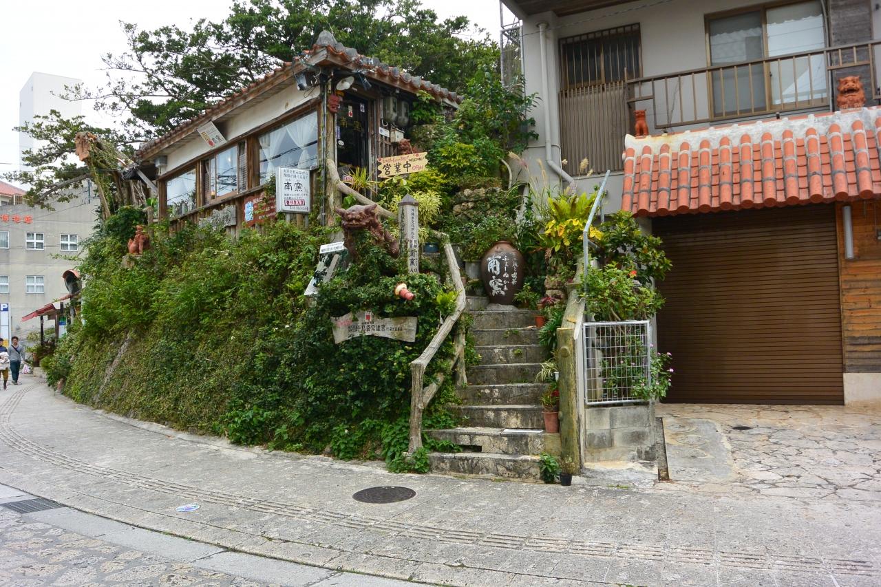 石畳の道に瓦屋根の昔ながらの焼き物のお店。国際通りからほんのちょっと歩くだけで、癒しの空間です。