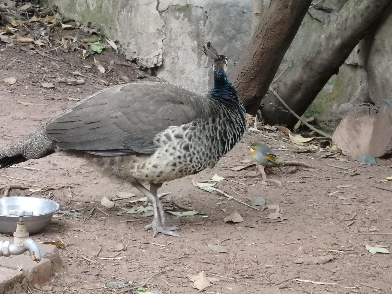 > 野鳥でしょうか、クジャクのエサを狙ってましたよ。