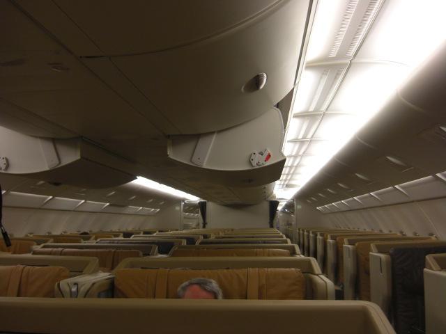 搭乗です。席のレイアウトは1−2−1ですべての座席が通路に面していて便利です。黄土色と茶色で座席の色が分かれています。