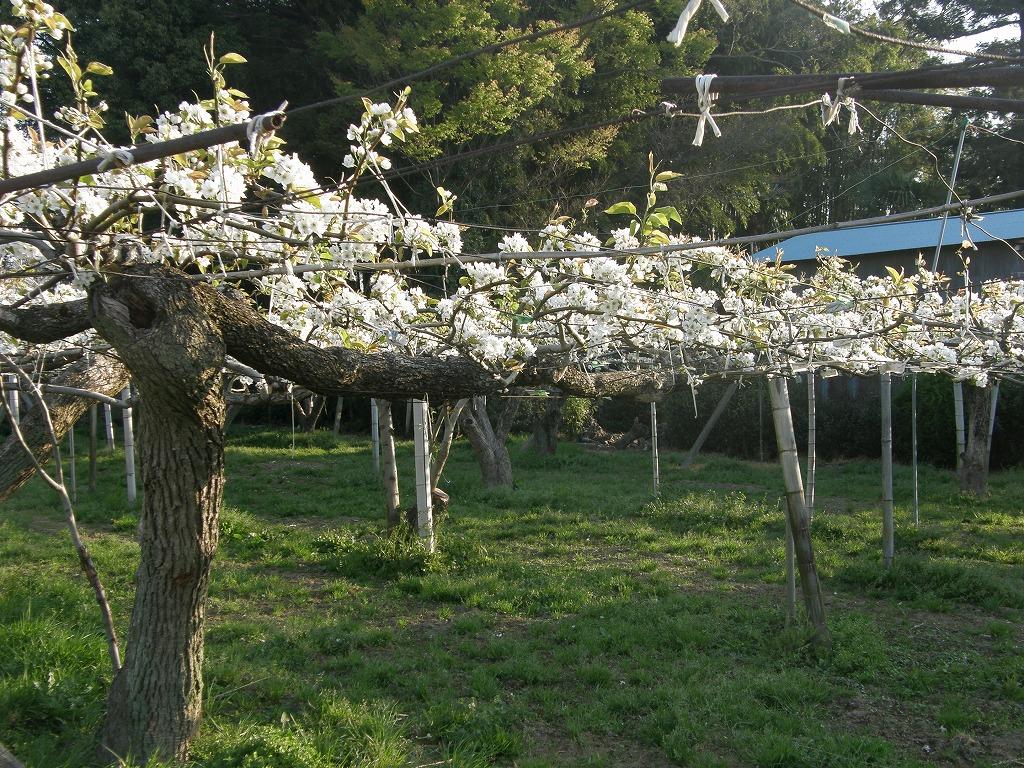 ⑦今年最後の桜を求めて、前夜の強風で・・・地元の特産、梨の花が満開でした