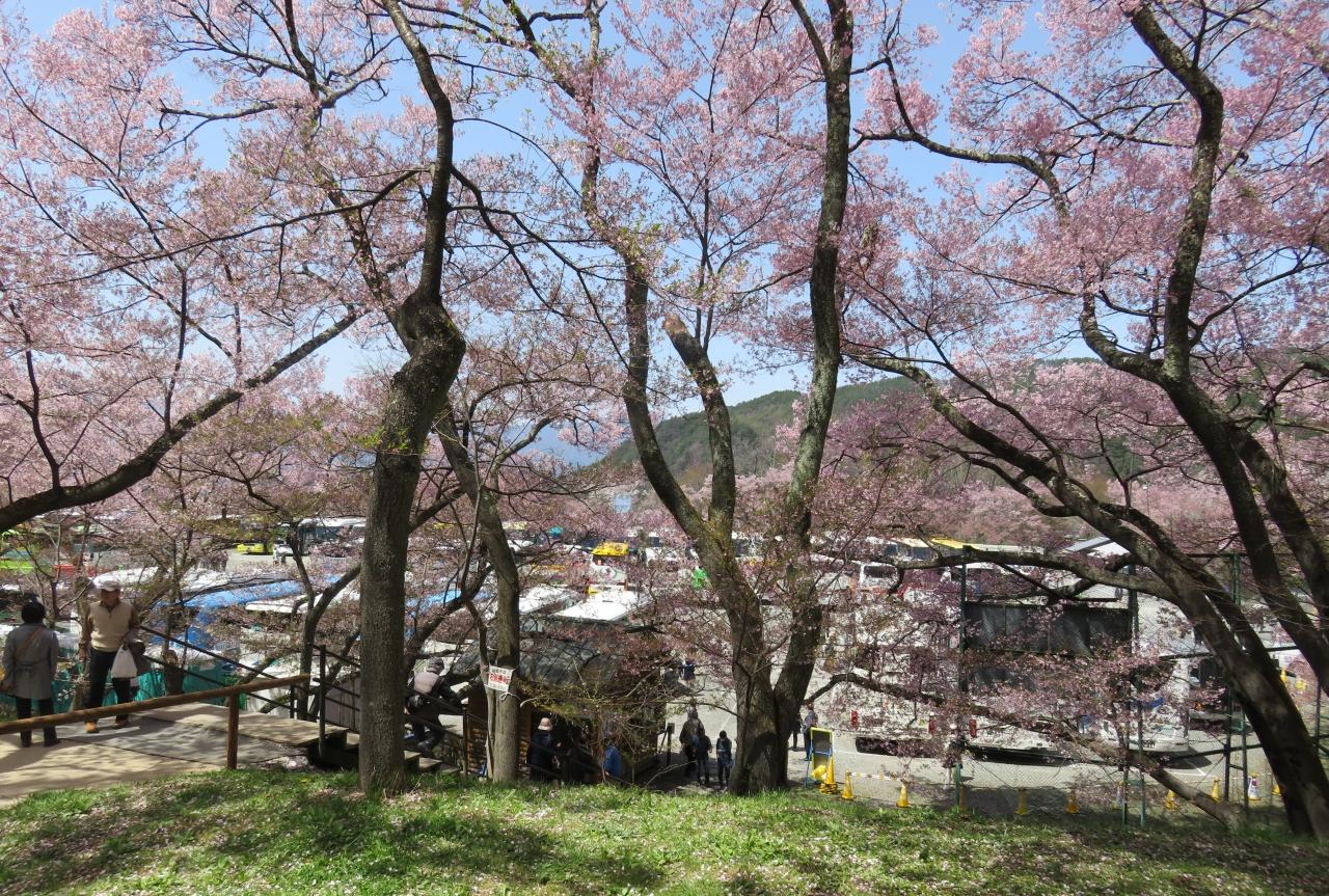 春日山城跡の桜見学を終え、2箇所目は高遠城址の桜見学です。国の史跡に指定された、日本百名城の高遠城址は、桜の名所としても有名です。駐車場の桜の光景です。天正10年(1582年)の高遠城の戦い以降、あっという間に武田家は滅亡に向かいました。