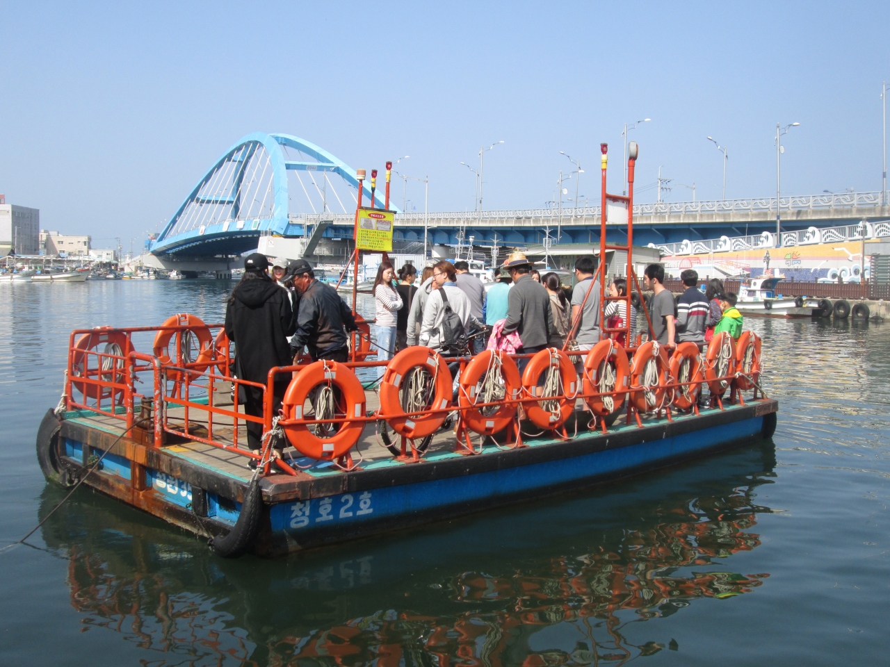 束草高速バスターミナルの前から歩いて束草ビーチを見てEマートに入ってフードコートで昼食をしました、食後大通りを歩いて雪岳大橋を渡って映画の撮影地になった人気観光スポットアバイ村に、観光客がいる街中散策の後、人気の乗り物渡し舟・ゲッペに乗って対岸の中央洞の商店街を少し散策しました。