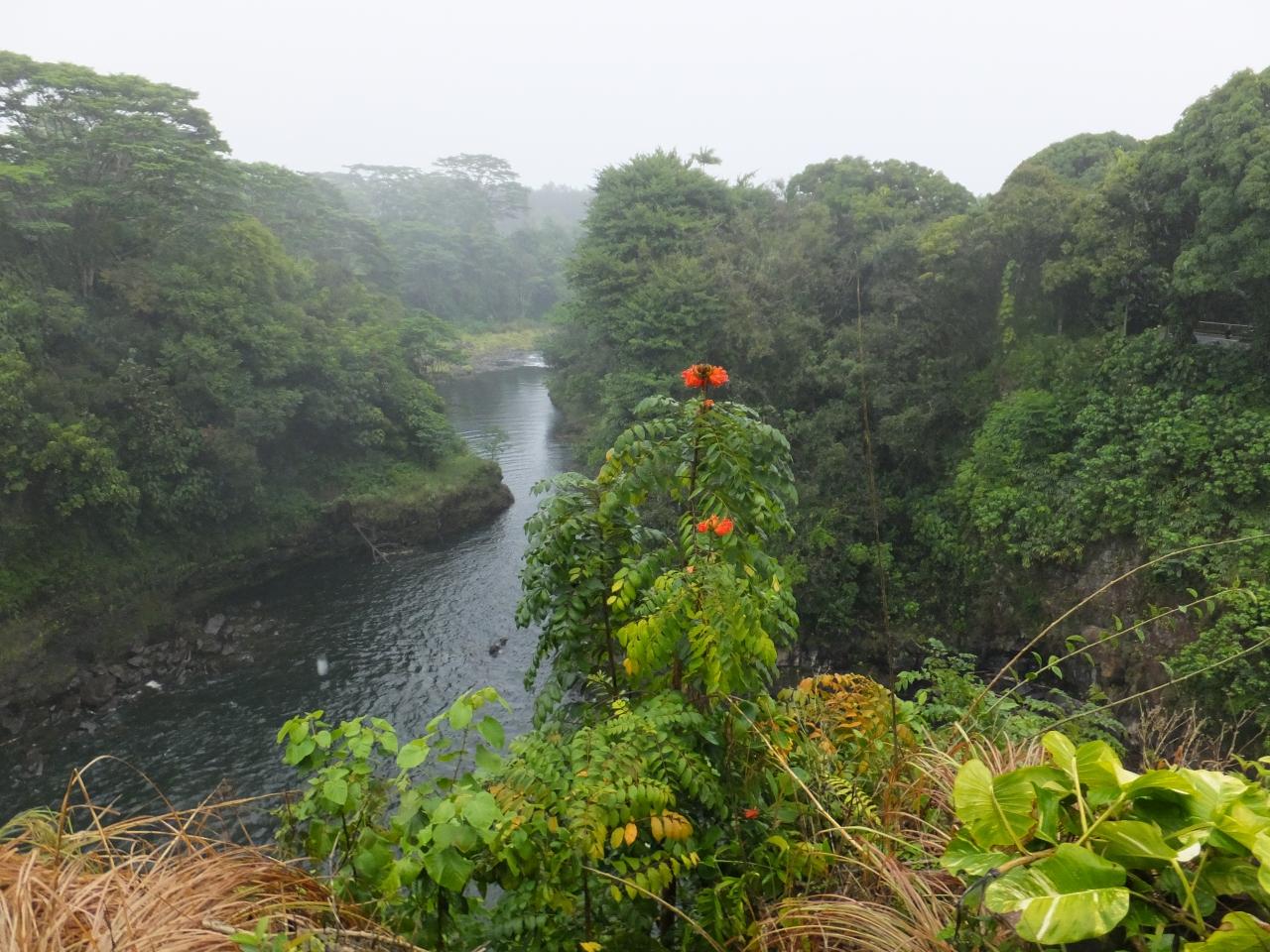 ガイドの長谷川さんからは、滝を見ながら周りのシダや草花の説明が始まりました。詳しくてついて行けません。ハワイ島の元々の植物は、外からやってきた外来の品種に駆逐されてきたそうです。草花や動物も。ハワイ固有の物は絶滅危惧種になったものが多いそうです。