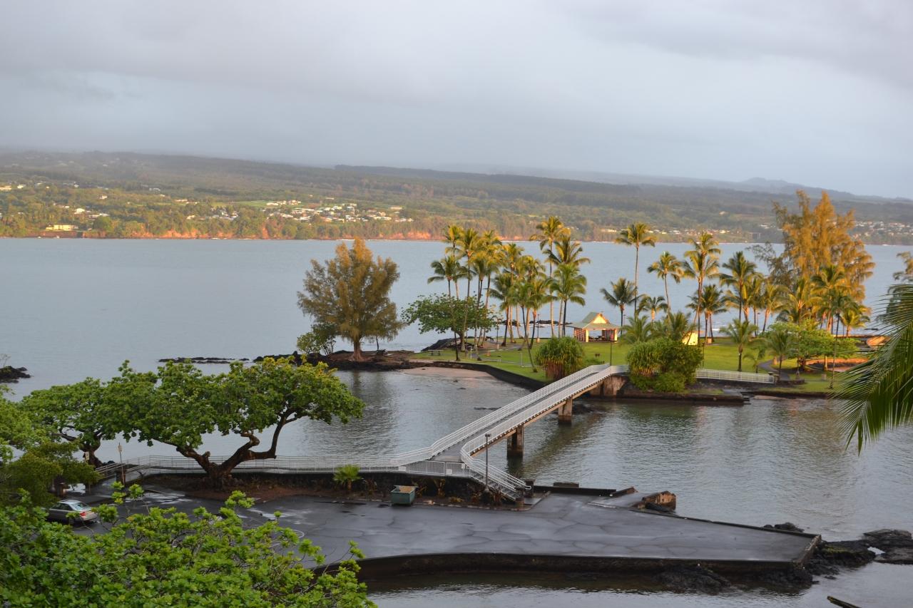 4月18日から23日まで妻が所属する東京民医連退職者の会のツアーに参加しました。ハワイは2回目ですが、ハワイ島は初めてで火山の島ぐらいの予備知識しかないまま参加しました。ツアータイトルは「ハワイ島ウォーキングと文化体験」でした。富士国際旅行社が主催で、現地ヒロからネイチャーガイド長谷川久美子さんが最後まで案内してくれました。その初日は、ヒロの空港からホテルまでのガイドです。現地は雨で歓迎してくれました。良く雨が降る街と聞いていましたが、その通りでした。強い雨ではなく、小雨でした。ミニバンでまずは、レインボーフォールズへ。滝の水量はかなりありました。ハワイ島には滝が何カ所もあり、観光名所になっています。滝を見た後は、街の中へカメハメハ大王のモニュメントへ。