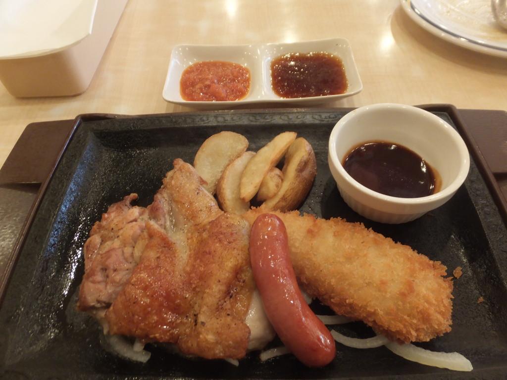 「ステーキガスト」でランチ定食。今日のランチはチキンステーキ、はさみチーズフライ、ソーセージ&カレーライス、税込754円。イマイチでした、残念。夜の食事は美味しいのですが。