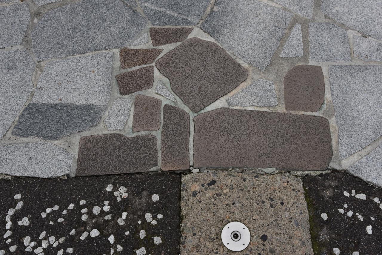 歩道に埋め込まれた、笹をモチーフにした銅製のパネル。