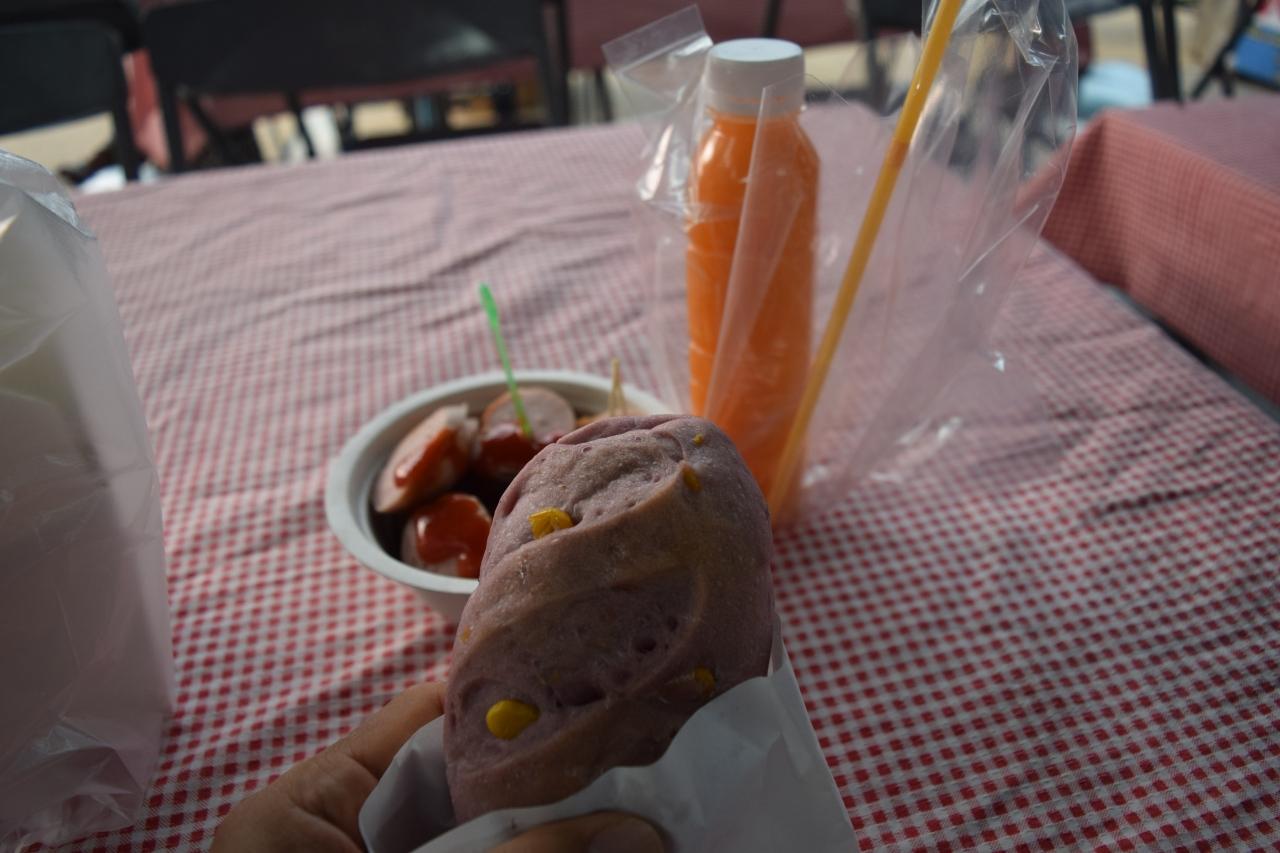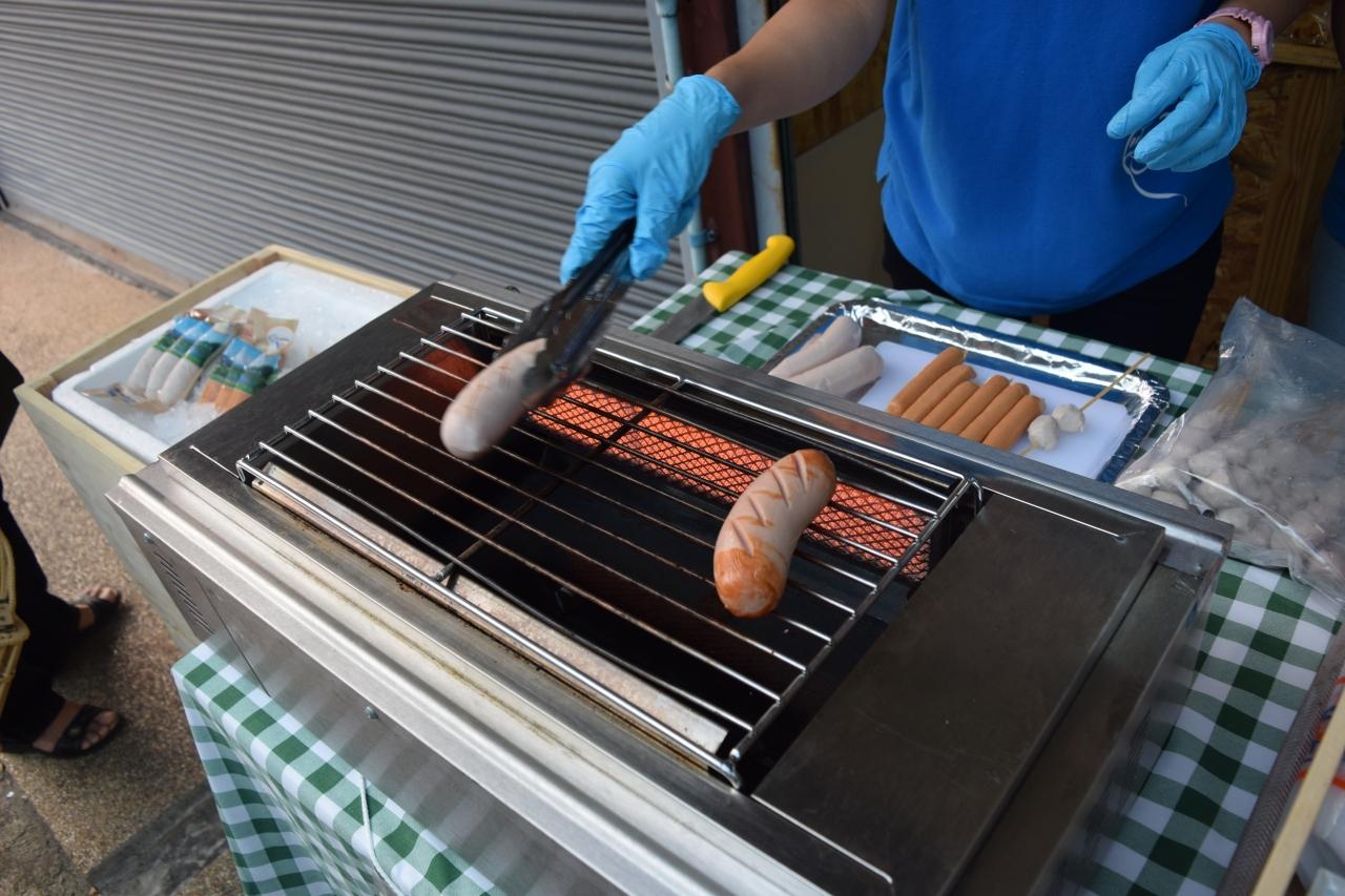 焼きたての豚のソーセージを食べやすくカットしてケチャップをかけてもらいました。 -