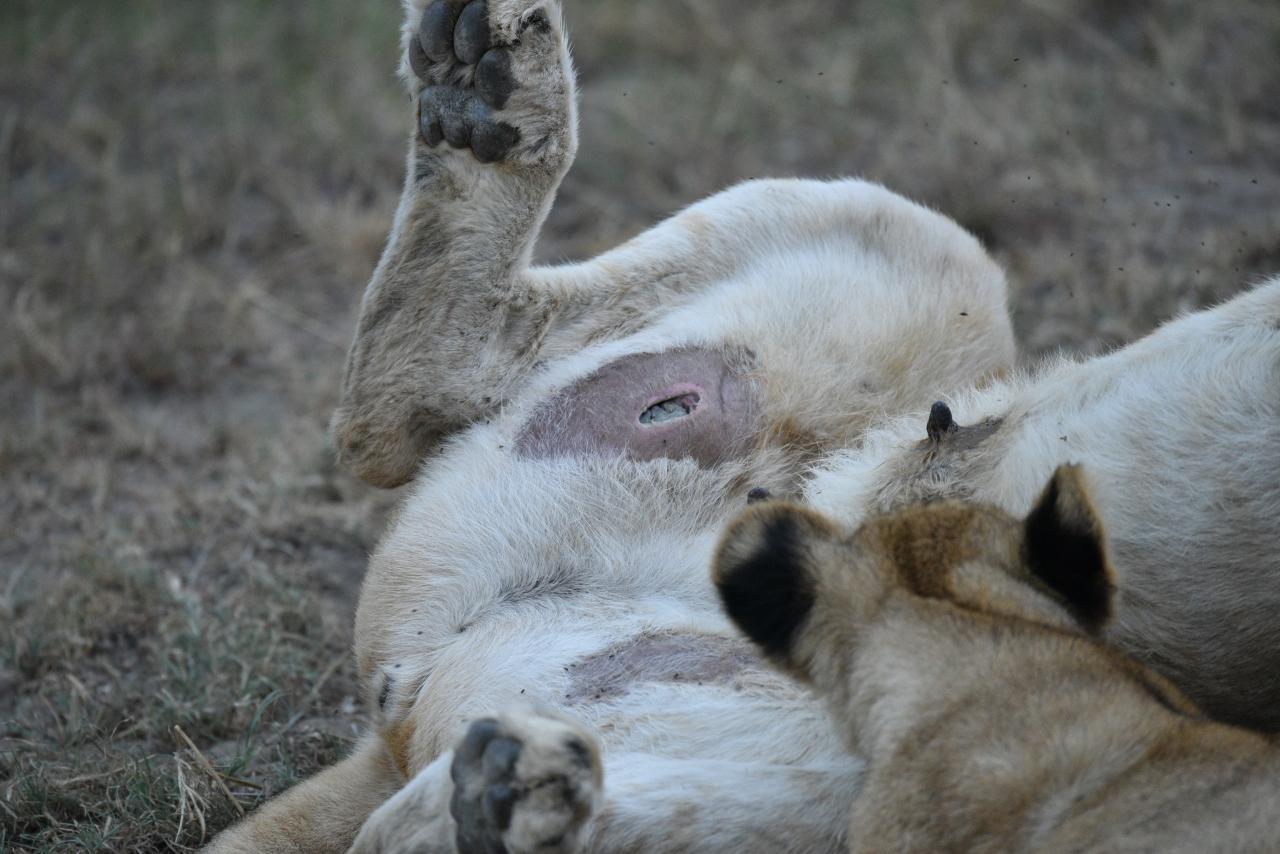 この日もハンティングを待っていたが、ストレッチをするだけ。人もライオンも、カラダの柔らかさが若い証拠。 -