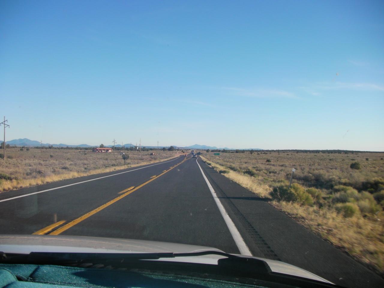 まっすぐな道、フロントガラスが虫の体当たりで汚れていてピントが合ってません。
