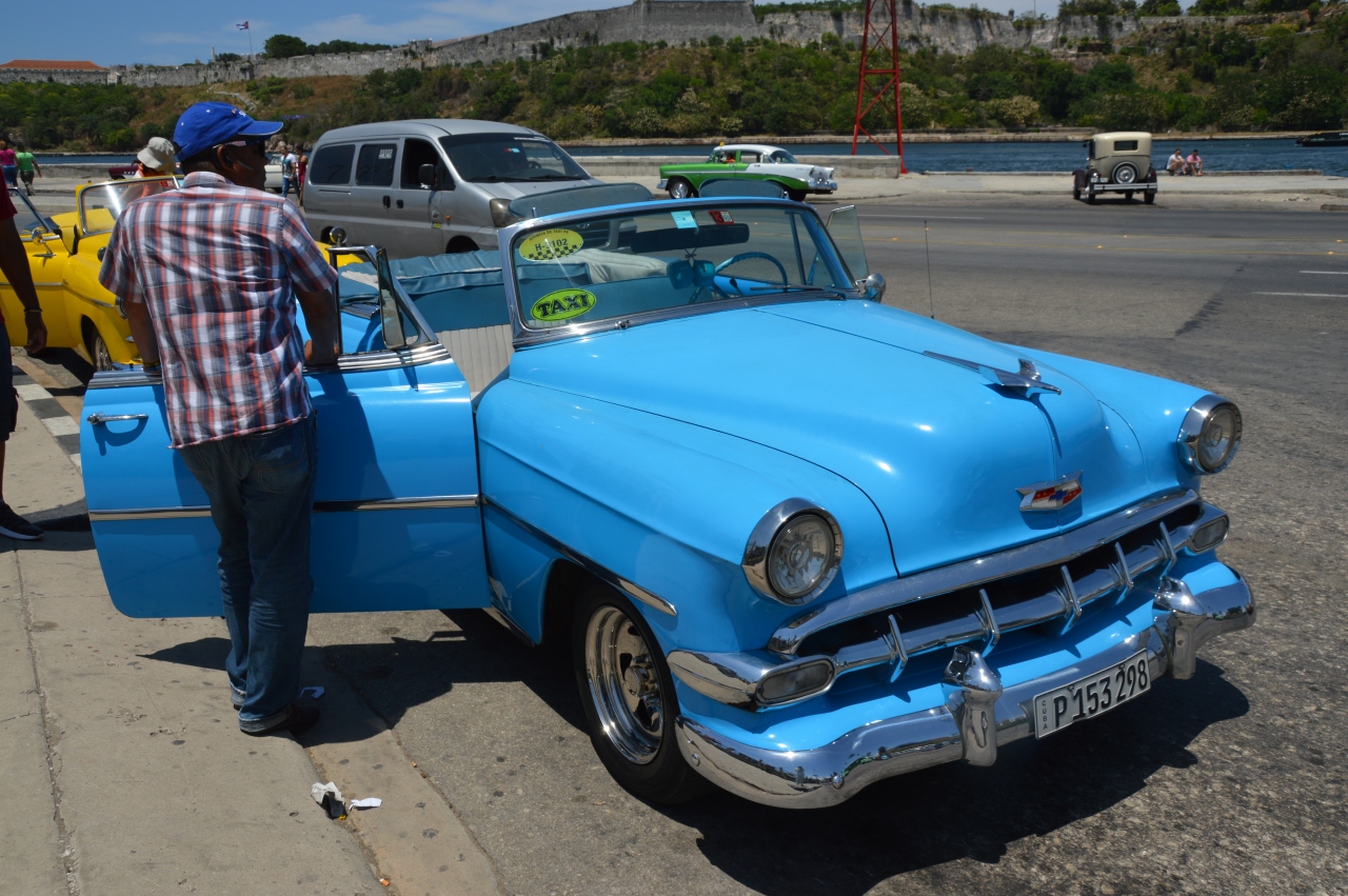 旧市街からタクシーに乗る。クラッシックカーで30CUCと言われるも、普通のタクシーで結構というとそのまま20CUCで交渉成立。30分ほどかかった。車の内装は派手。隣に乗る。 -
