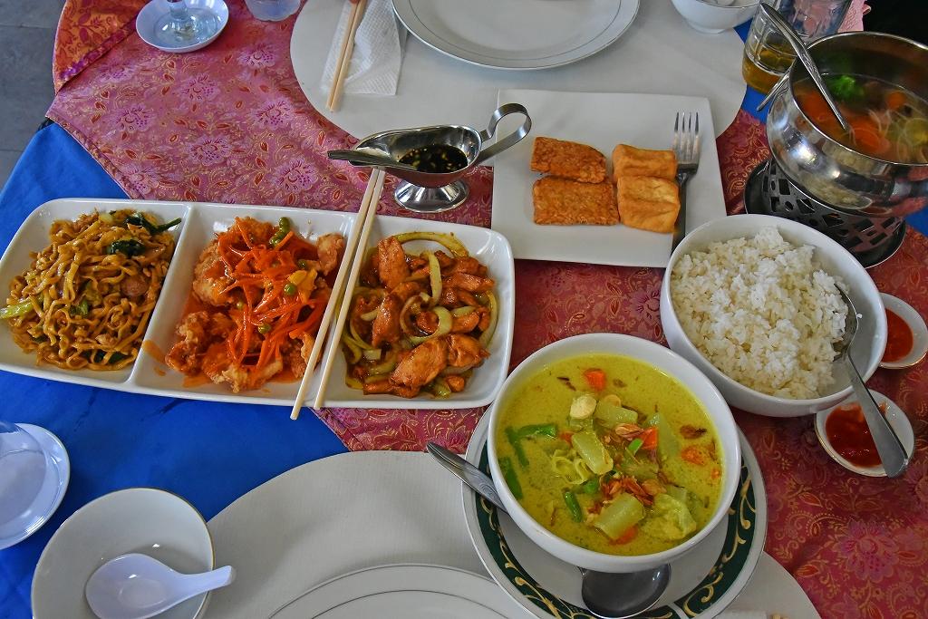 並んだ2人分の料理は、左からミーゴレン(焼きそば)、ナマズのフライ(甘酸っぱい味付け)、鶏肉の炒めたもの、厚揚げ・納豆、ジャワカレー、ご飯、野菜スープ。これを自分用の大皿に盛り付けて食べたのだが、どれも中華料理に似ていて、美味だった。特にナマズのフライとジャワカレーは、あっさりしていて口に合った。 -
