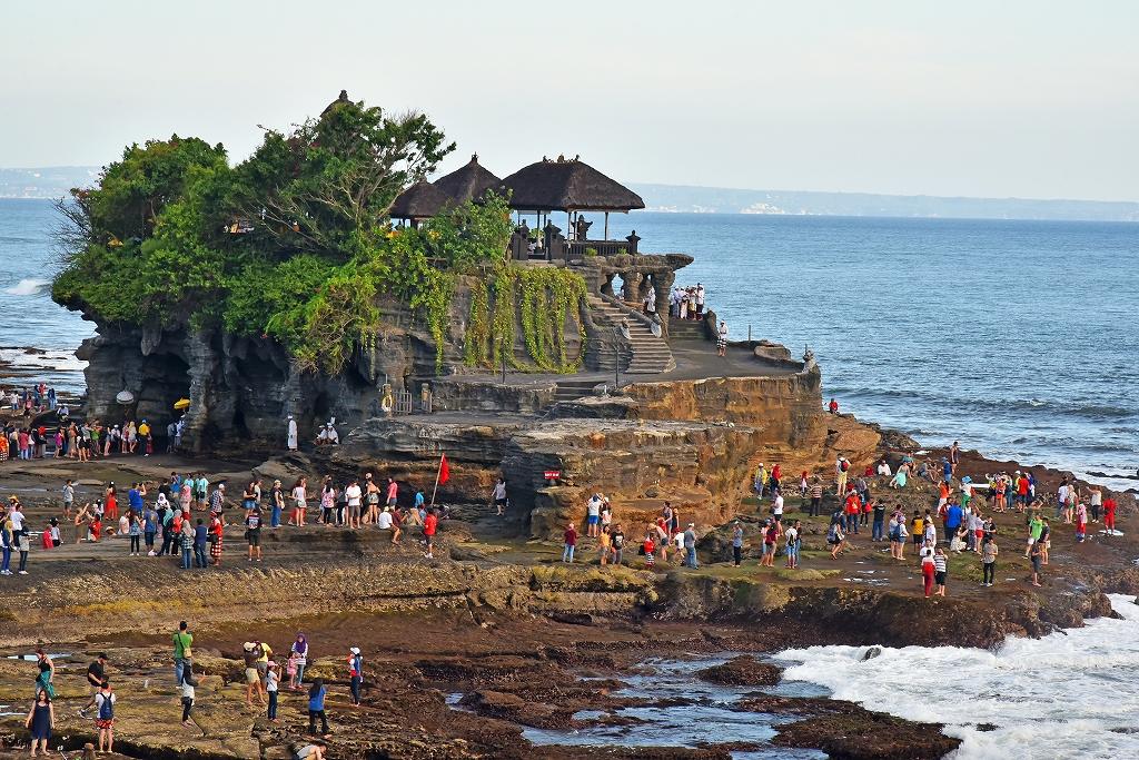 目指すタナ・ロット寺院。この日は、丁度干潮の時間帯で大勢が周りに集まっていた。