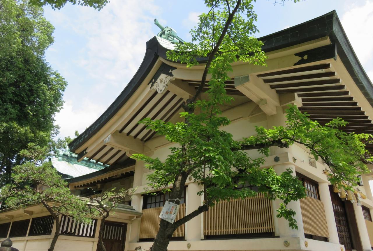 手水舎の光景です。銅葺屋根に、薄いクリーム色の柱がよく似合うお洒落な造りでした。鉄筋コンクリート製ではなく、ちゃんとした木造の手水舎でした。