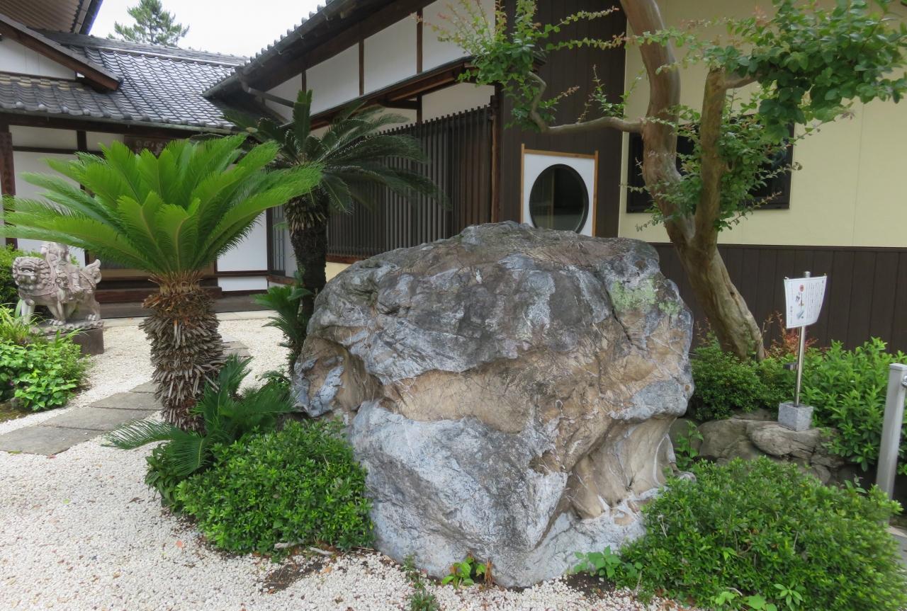 庫裏らしい建物の近くにあった、庭石とソテツの光景です。白い筋が縦横に走り、横方向に大きく抉られた久保利があった、奇石と呼んでいいような庭石でした。