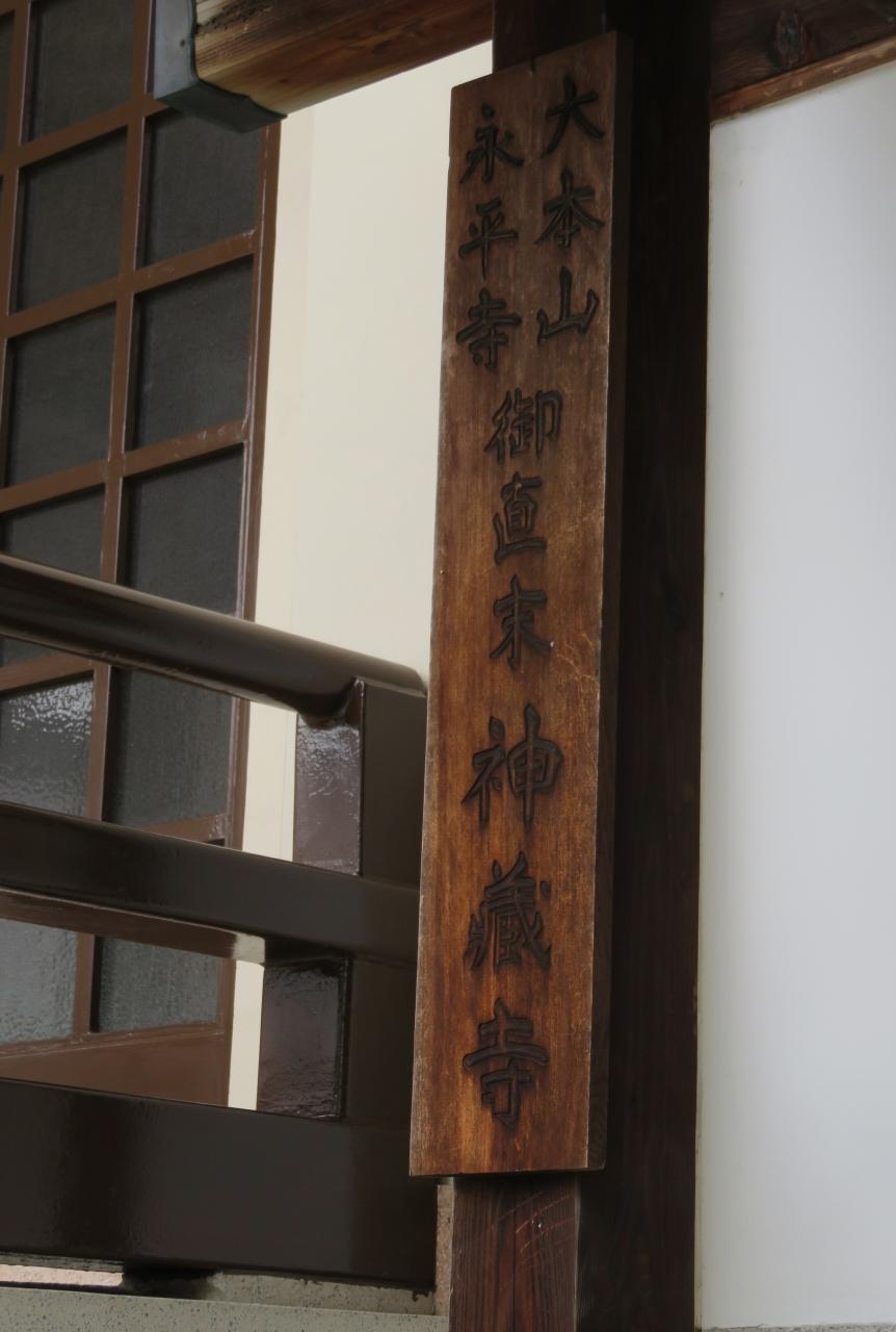 金文字で記された、右から読んで『神蔵寺』の扁額です。大本山永平寺から、勅賜された額であることが大光圓心禅師の落款部分に記してありました。大光圓心禅師は、永平寺73世の熊澤泰禪禅師(1873~1968年)のことです。