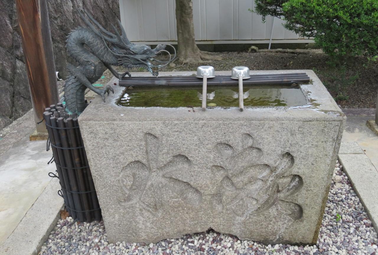 手水舎の水盤の光景です。側面に大きく『漱水』の文字が刻まれていました。注ぎ口は、型通りにブロンズ製の龍の口でした。