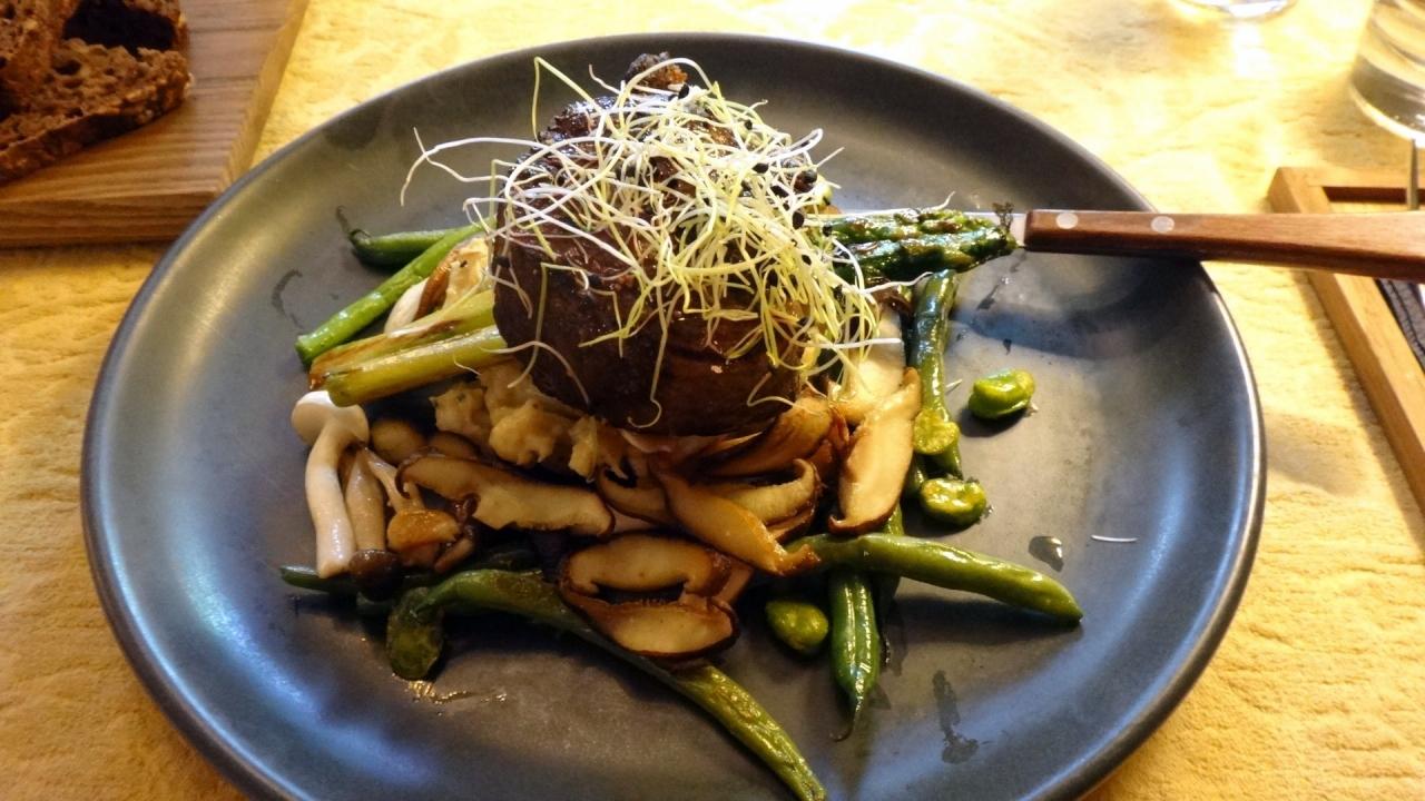 料理の設定が面白いのですが、野菜が中心で、その野菜の上に肉をのっけると、プラスα、という設定なんです。