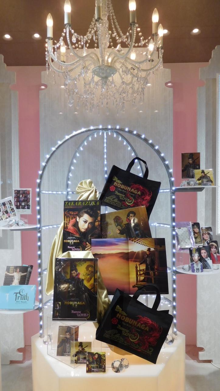写真の真ん中に展示してある公演「NOBUNAGA」などに関するグッズ。