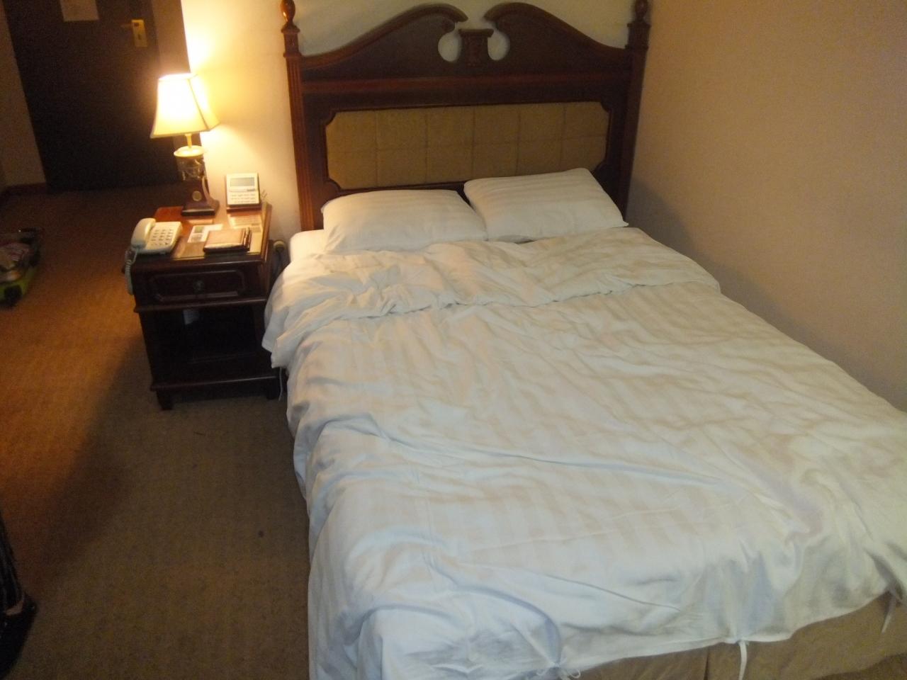 おまけに、ホテルについてびっくり、まさかのせまめのダブルベッド!笑