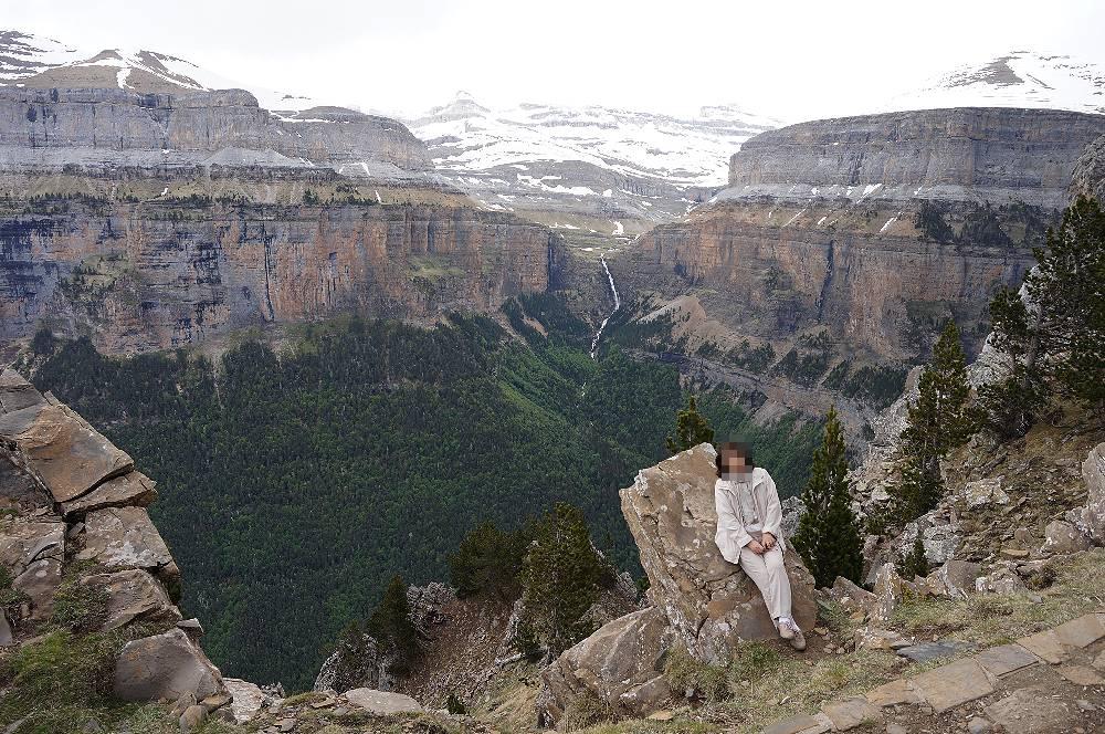 第2展望台を後にしてしばらく走ると、また車が停止。車から下りると、有名なローランの割れ目が見えた。オルデサ渓谷から国境を超えたフランス側は、ガヴァルニの谷になっていて、その谷からもこの割れ目がよく見えることで有名なのだ(私たちも、2007年の南仏ドライブ旅行でガヴァルニの谷を訪れている)。