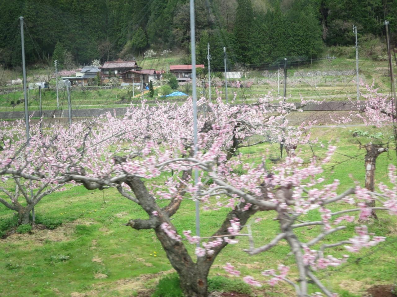 国道41号線の斜面には枝垂れ桜と桃の花で辺り一面はピンク色に染まっています。 -