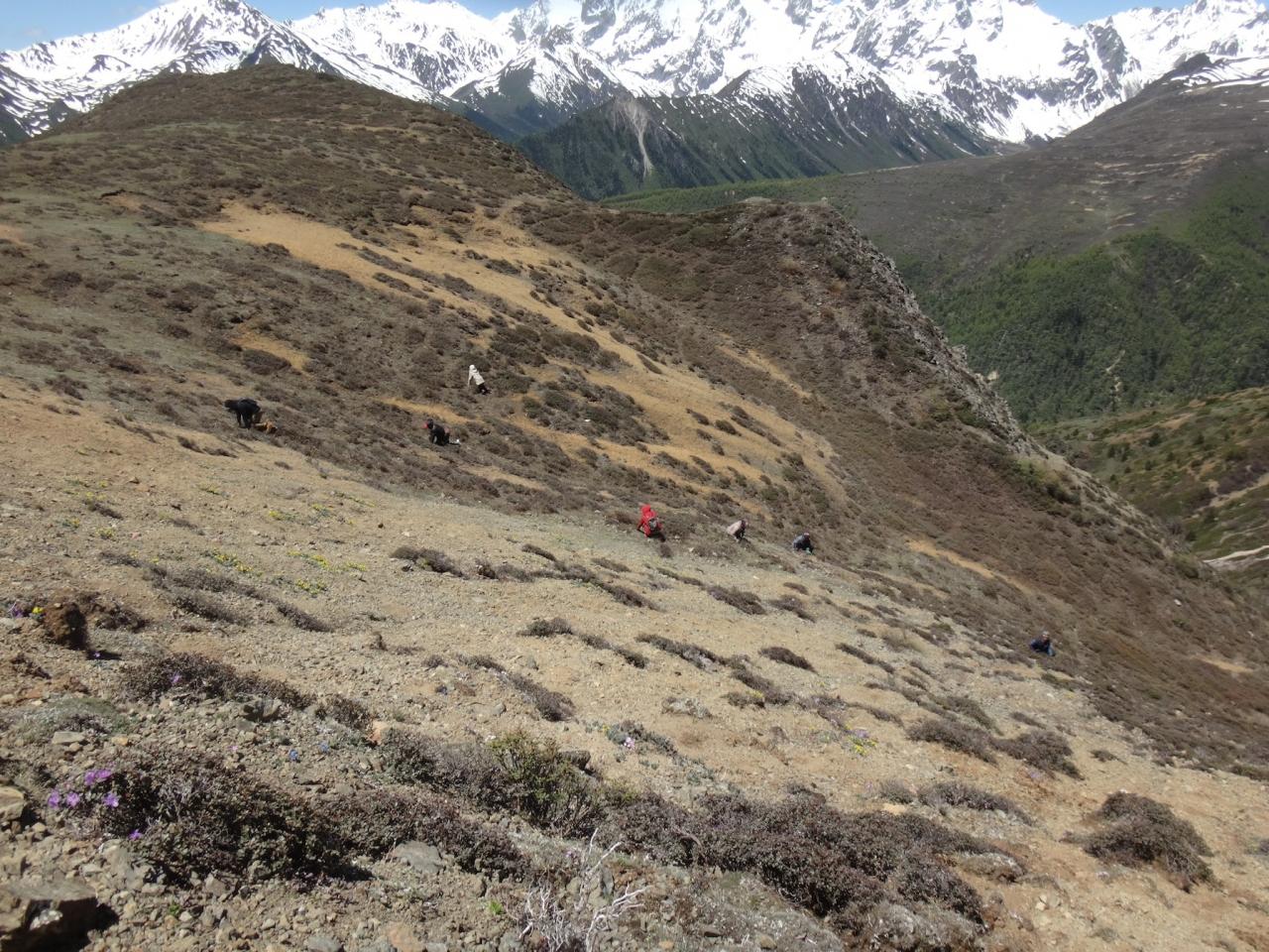 下の方の斜面では冬虫夏草を採集している地元民が沢山。でも一日やってどのくらい採れるんだろう。価格から推測して一日やって一人数本採れりゃあいいほうなんじゃあないでしょうか。