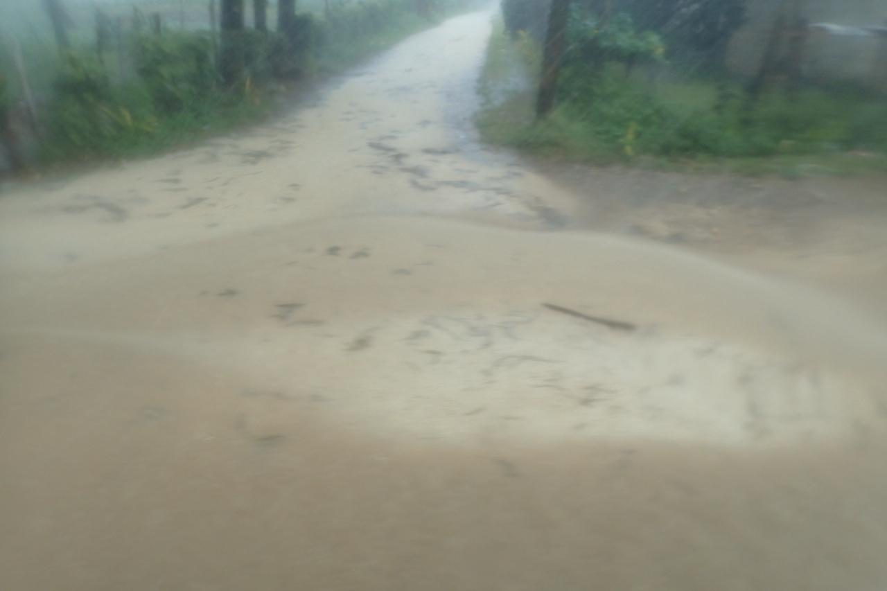 路面の舗装が無くなって車のすれ違いができない道幅となりました。