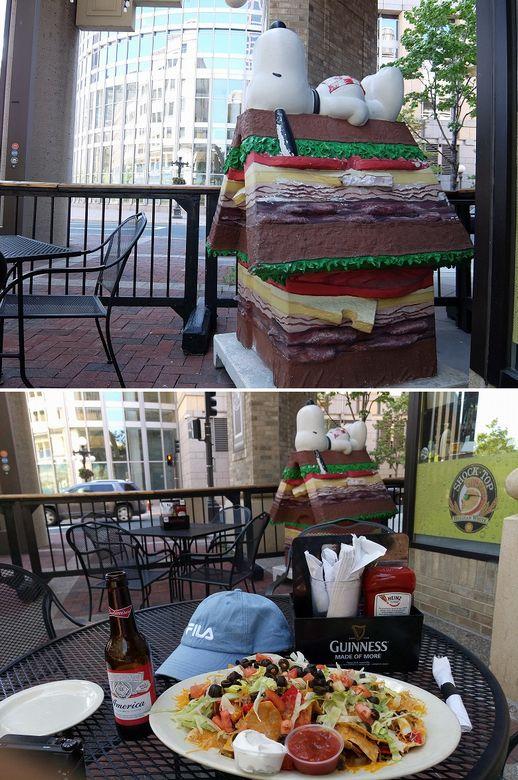 喉を潤すためのビールと昼食(予想外に超大盛だったナチョス)を食べた Wild Tymes という飲食店のオープンスペースの一角にもスヌーピーが置かれていた(2枚連結)