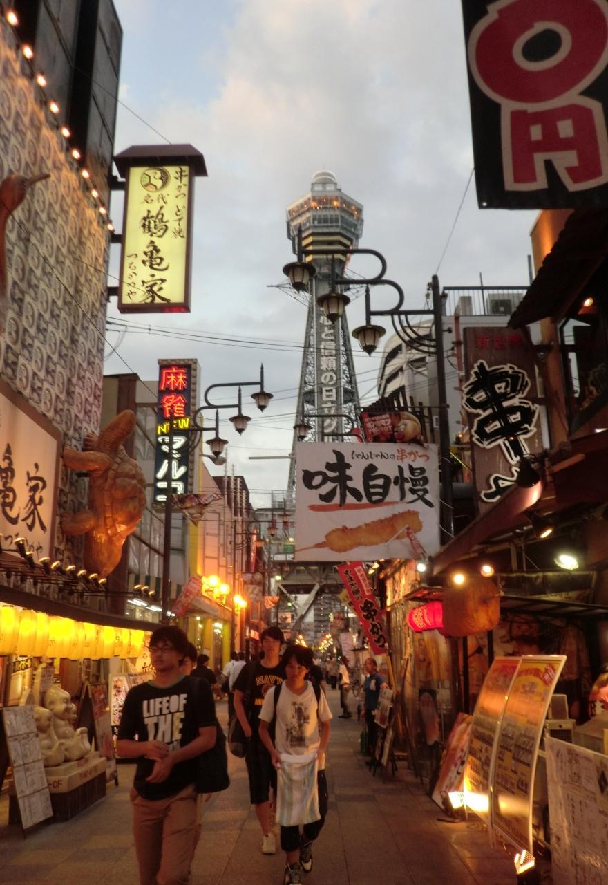 ぼつぼつ灯りも点り始め通天閣が見下ろす雑踏は賑やか