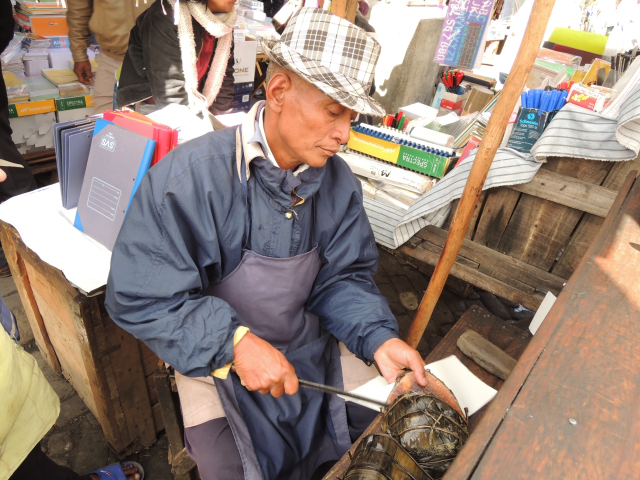 マーケットで“クーバ”を食べた。米粉+ピーナッツ+黒砂糖で出来た生地をバナナの皮で包み低温で3日程度蒸す。もっちり甘く美味しい。