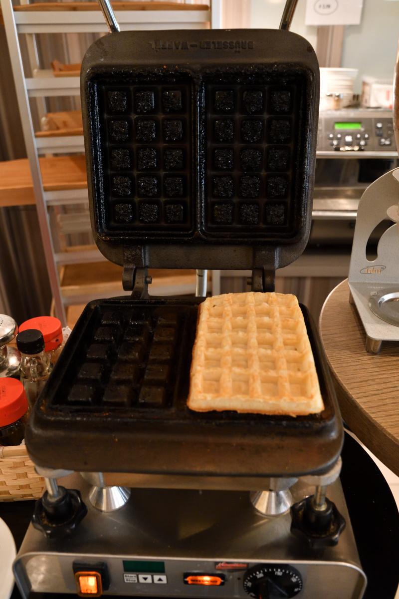 このホテルの朝食会場には,自分でワッフルを暖める+焦げ目をつける機械がありました.