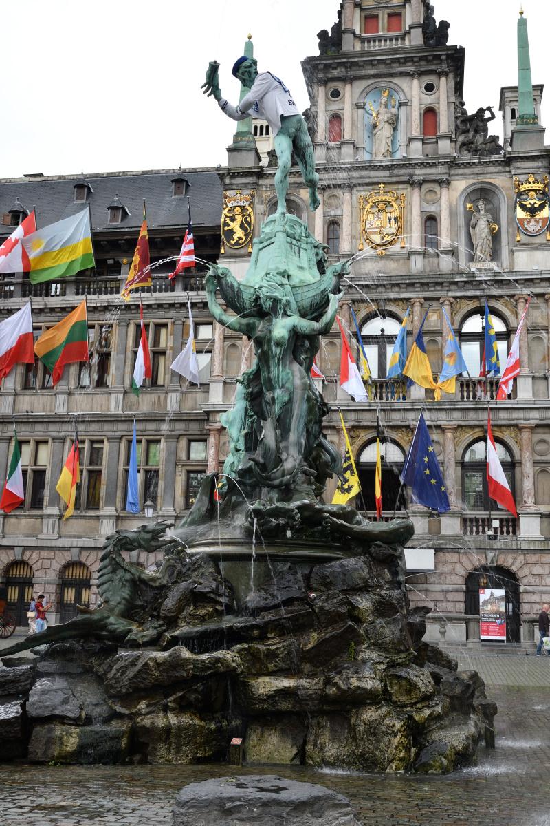 古代ローマの兵士Braboがシュヘルド川で猛威をふるっていた巨人の手"ant"を切り取り投げた"werpen"という伝説があり,これがアントワープの由来とされているそうです.ブラボーの像 モニュメント・記念碑