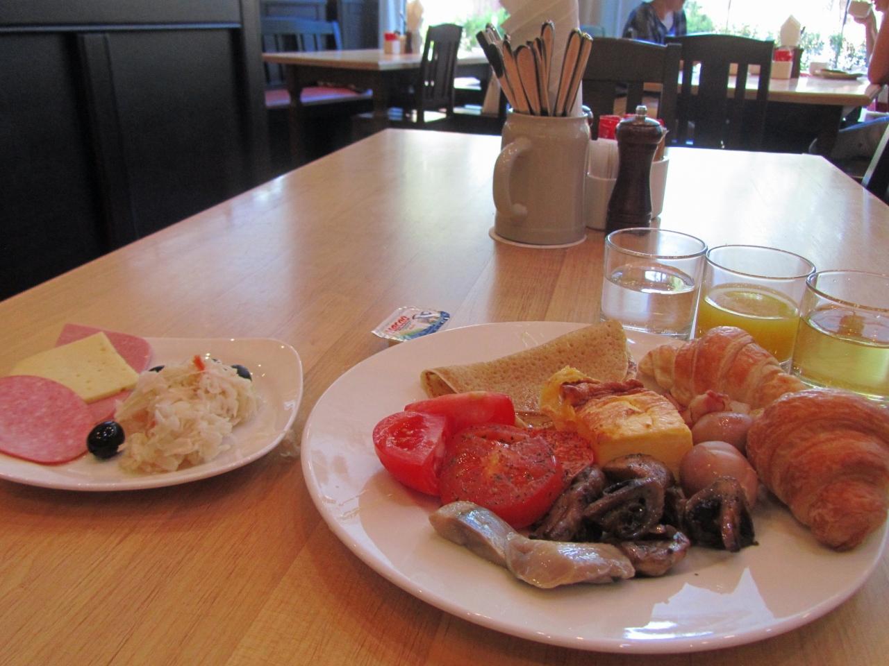 温かい料理はスクランブルエッグとか、ソーセージとか、ブリンチキとか