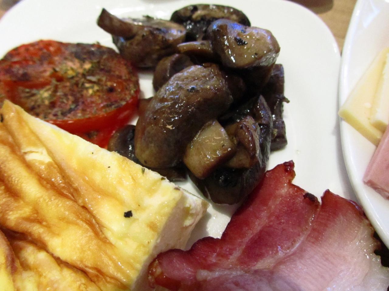 キノコ炒めとか、焼きトマトのチーズのせを手前に、どーんと1日目の朝食