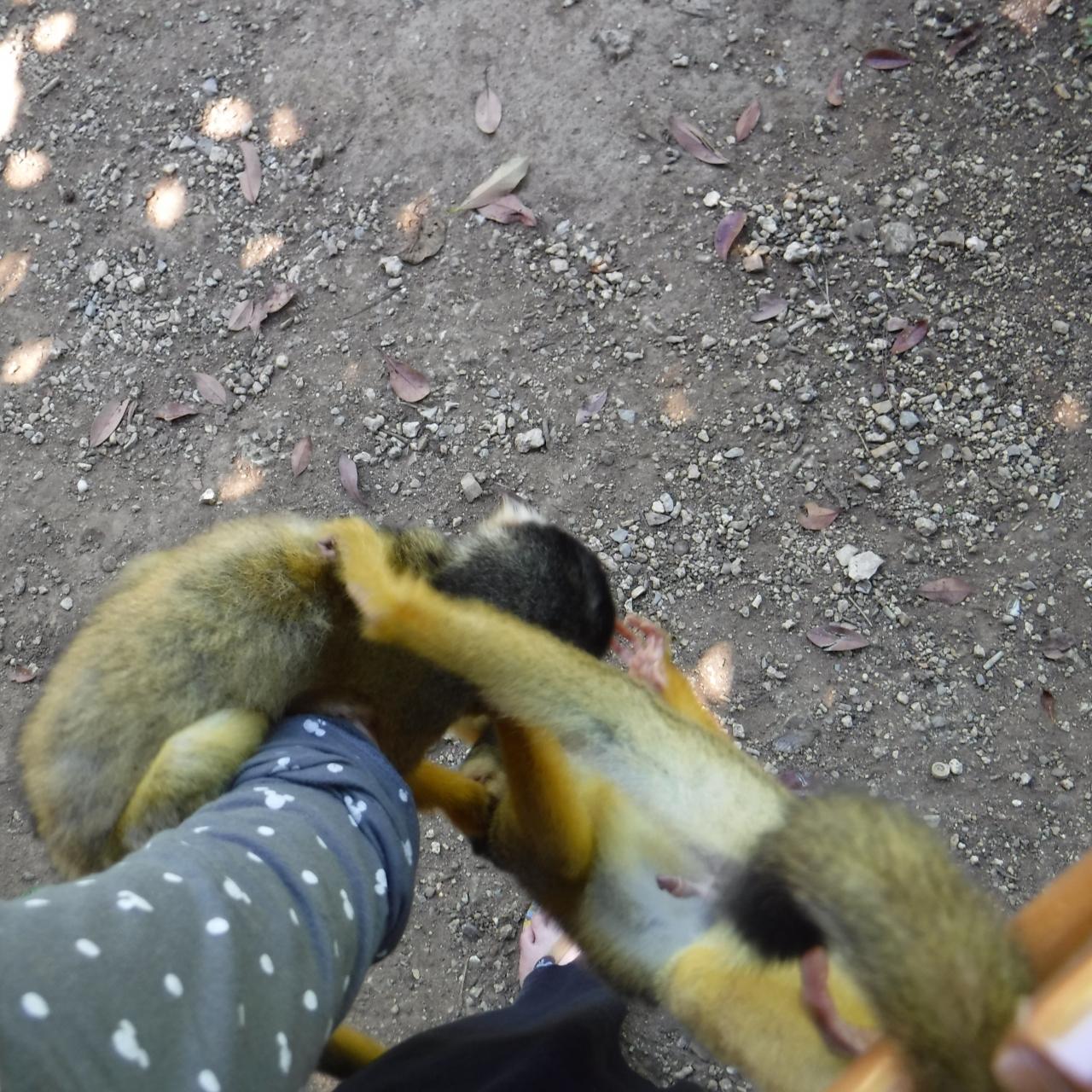 リスザルの森に来ました。ここが一番の目的です。サルが乗っているのが餌が入ってるガチャです。1個200円です。