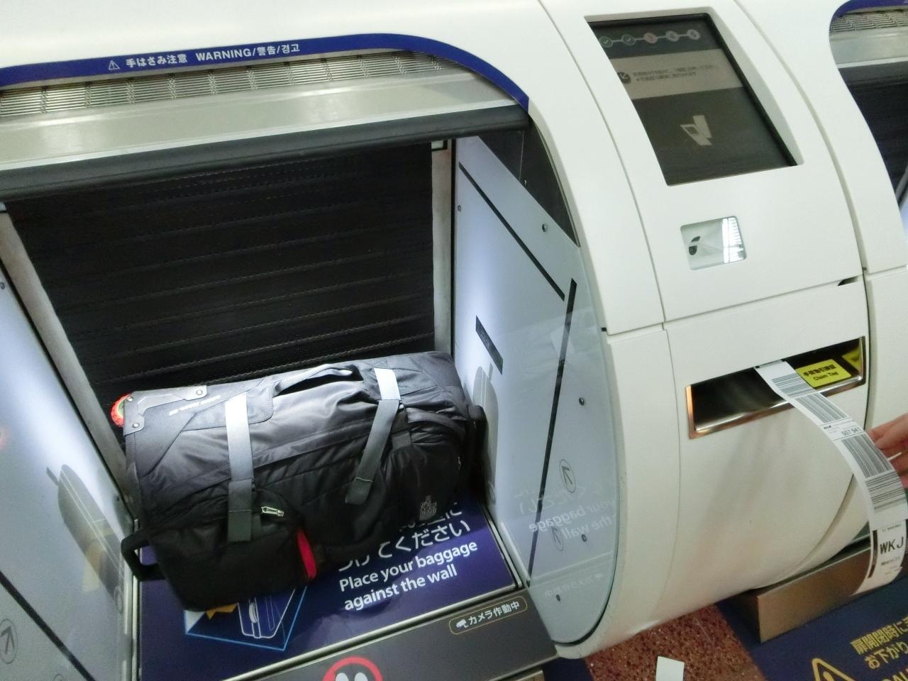 チケットをかざし荷物をあずけ、出てきたバゲージタグをつけると扉が閉まり、バゲージ引き取り券を受け取ります。