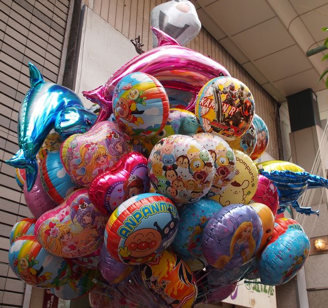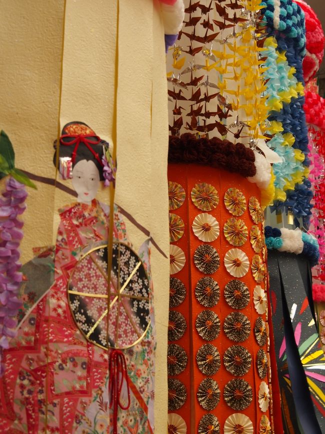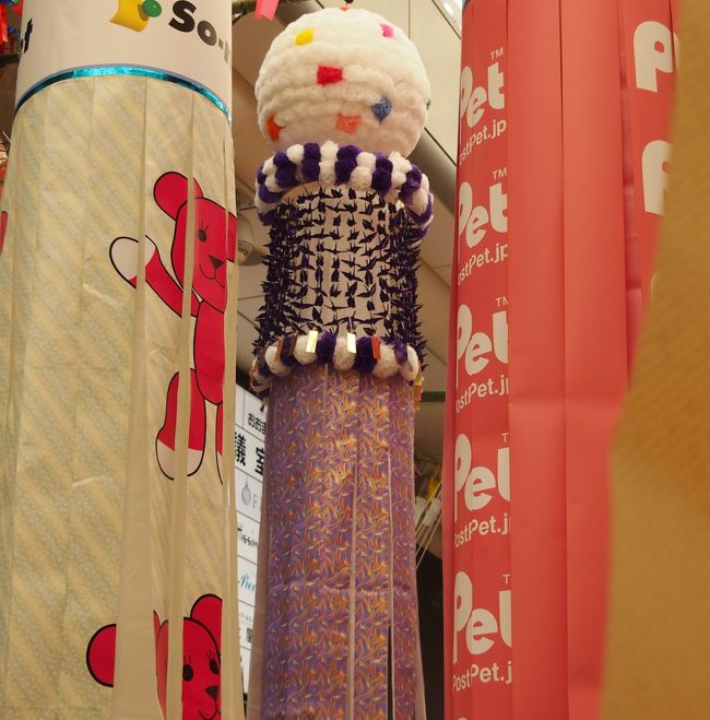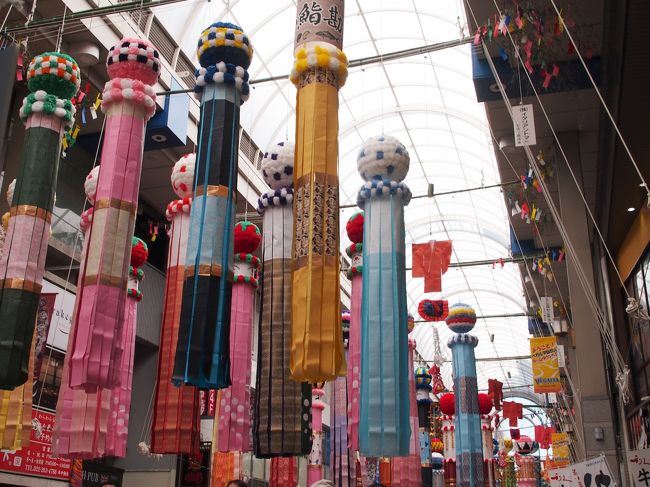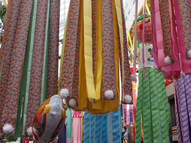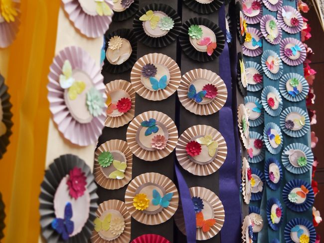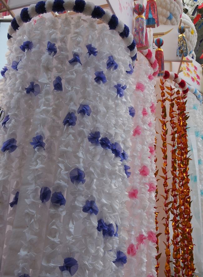 一番町四丁目商店街の、お店側の上だけにあるアーケードには、仙台の子供たちが作った小さなくす玉と吹き流しが並んで、華やかさを添えています。