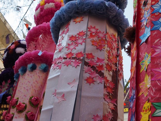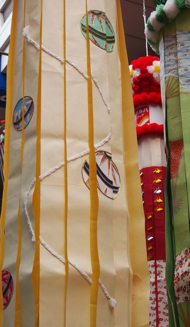 東西のアーケードでは、天井にまっすぐに渡された竹に飾り付けられていましたが、南北の商店街では、下から斜めに立てかけた竹に吊るしています。 -