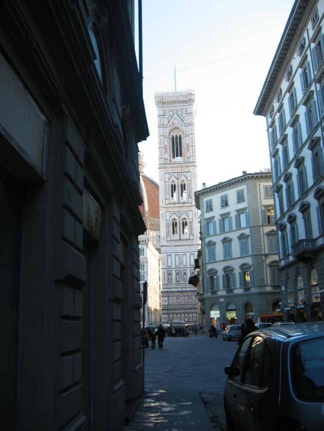 ジョットの鐘楼が見えます。サンタ・マリア・デル・フィオーレ大聖堂の脇に建設されている高さ約84mの塔です。1334年に着工、1387年に完成とのことです。