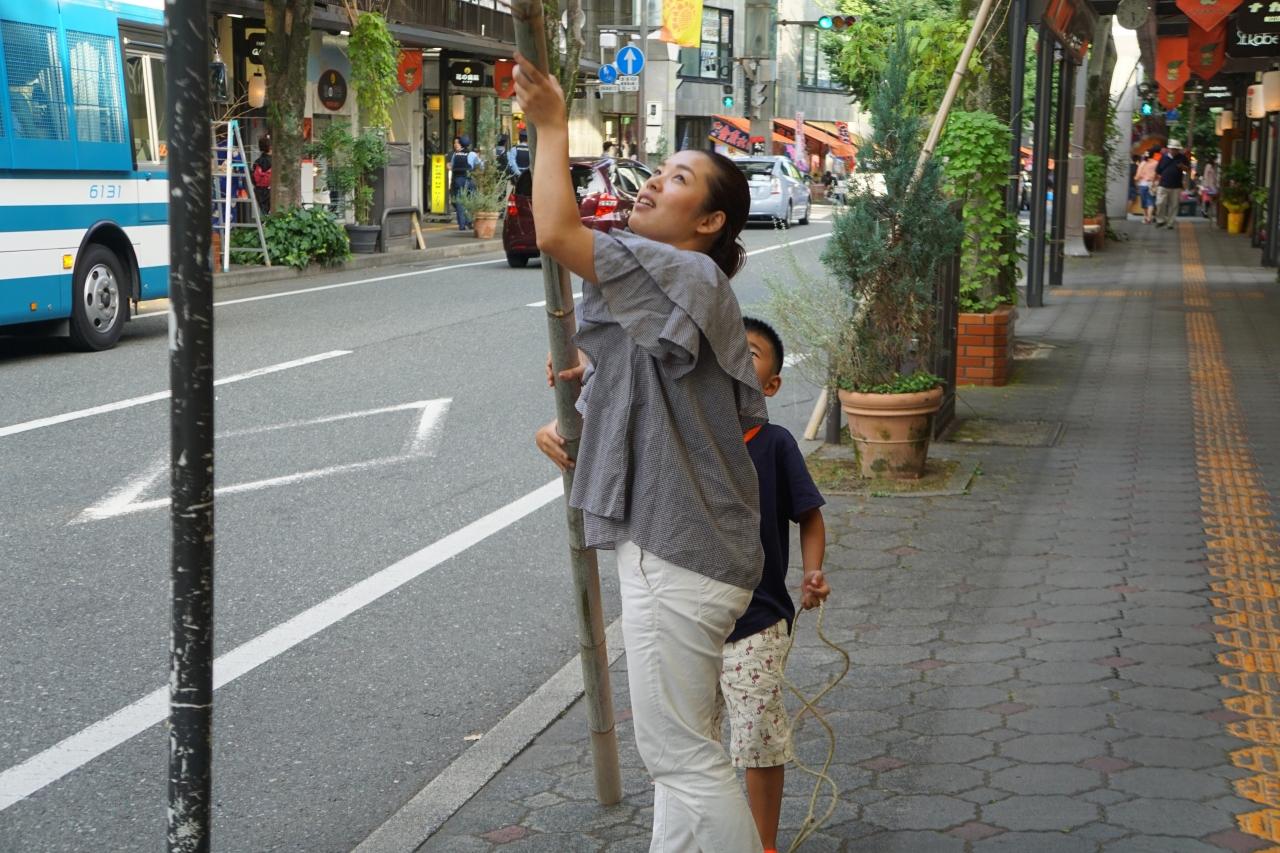 山口市中心商店街は、山口市街の中心。ちょうちん祭りでは、ここにも提灯をぶら下げた笹竹がずらりと立ち並んで、提灯のトンネルが出現。ちょうちん祭りのメイン会場の一つとなります。灯を入れる準備ではそれぞれのお店の人たちが総出で懸命の作業。力を合わせて取り組む姿もとてもいいと思いました。