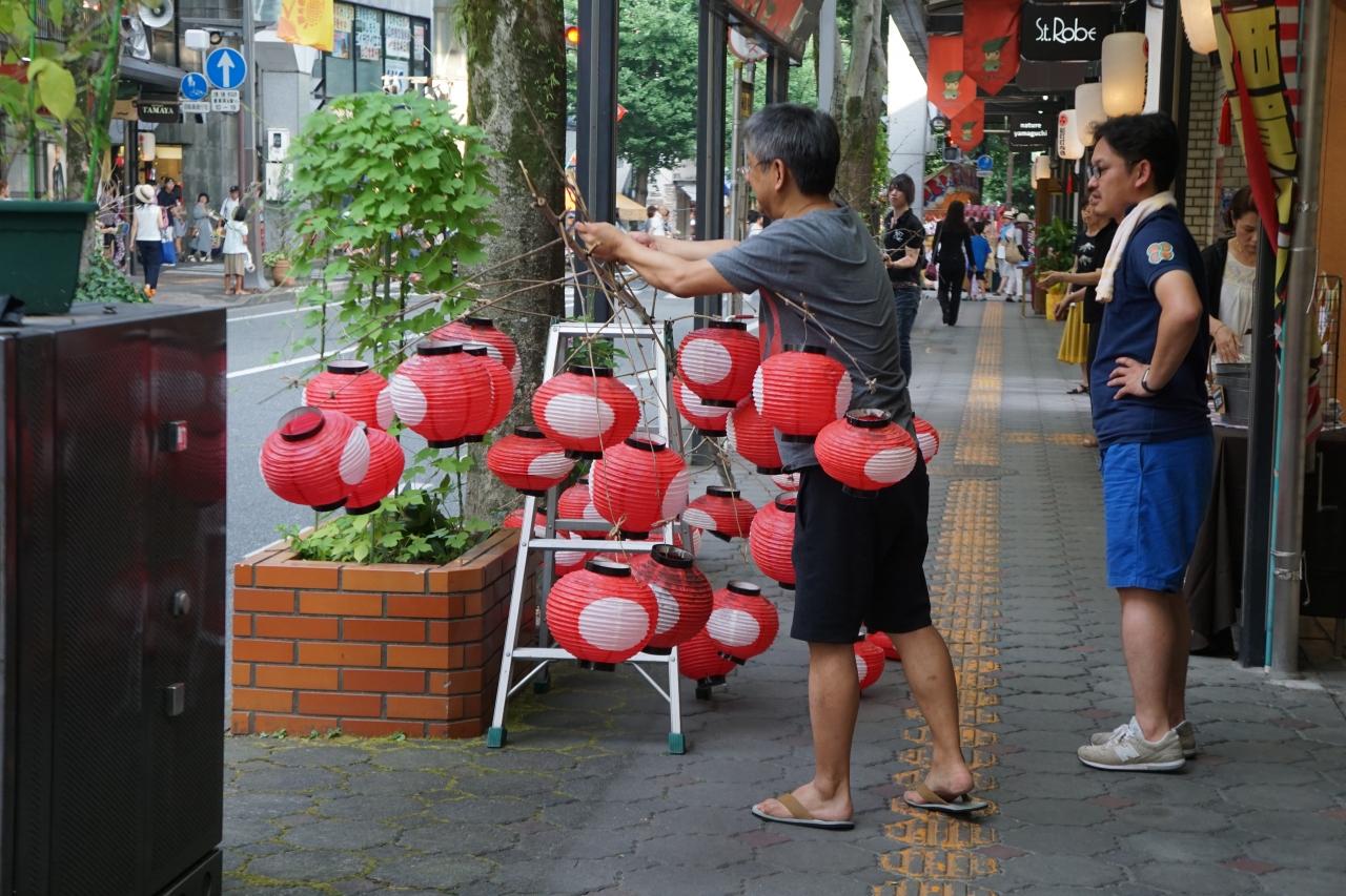 商店街のあちこちでは、皆さん、祭りの準備に余念がない。一つ一つろうそくを立てていて、これはけっこう手がかかるような。