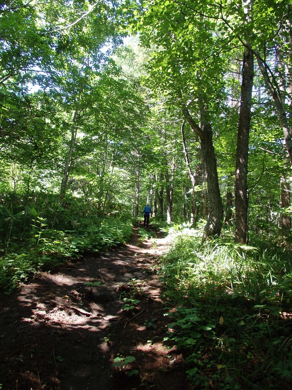 「コース概要」山の仲間18人と登る。 (9;37)(0;00) 登山口出発。最初は少し下る。直ぐに軽く登り始める。途中ハクサンシャジン、ヤマブキショウマ等が多く見られる。(0;20)休憩。(0;25)出発。(0;27)割と急な登りに入る。(0;48)急な登り終了。休憩。(0;58)出発。緩やかにのぼるが、途中より少し急になる。(1;12)姫神山山頂(1124M)に到着。360度のパノラマ、西に岩手山、秋田駒が見える。昼食をとる。(1;51)出発。一本杉登山口に下る。岩場の急下りを含め、かなりの急下りが続く。途中緩やかなところもあるがほとんど急下り。(2;36) 休憩。(2;41)出発。(2;53)5合目通過。(3;05)急下り終了。一本杉通過。水場あり。(3;16)一本杉登山口通過。(13;00)(3;23)駐車場到着。石川啄木記念館に寄るが休館。バスで打当温泉「マタギの湯」に向かう。旅館に到着。(所要約1時間半)。本日であった花は上記以外、ウツボグサ、ホタルブクロ、ヒメジオン、カニコウモリ、チダケサシ、ゲンノショウコ、オカトラノオ、アキノキリンソウ、シシウド、アザミ、オオヤマオダマキ、クガイソウ、タカネアオヤギソウ、ヤマハハコ、オオバギボウシ、ノリウツギ、ヨツバヒヨドリ、シラネニンジン、レイジンソウ、ウスユキソウ、ハクサンオミナエシ、イワキンバイ、ヤマジノホトトギス等であった。本日のコースは標高差もあまり無く、岩場急下りがあったが、歩き易いコースである。