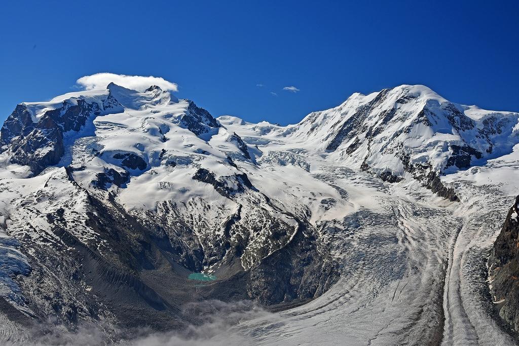 モンテローザの横には、リスカム(4,527m)があり、その間からグレンツェ氷河が始まっている。